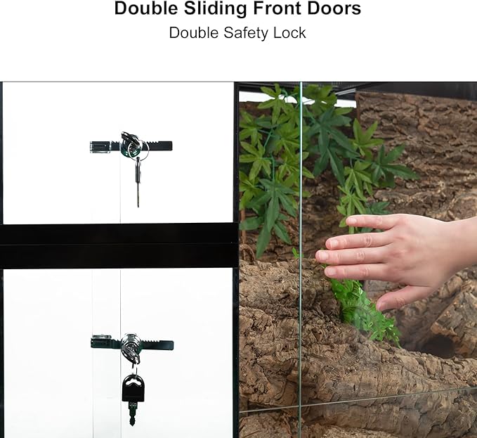 - 【Double Front Sliding Door】Adopt new patent design to be top grade small animal and reptile terrarium. In order to manage the tall reptile tank more conveniently, this bearded dragon terrarium has two upper and lower sliding doors. It's easy to clean the tank or add decoration. Safety lock prevents unwanted opening from children or pets.