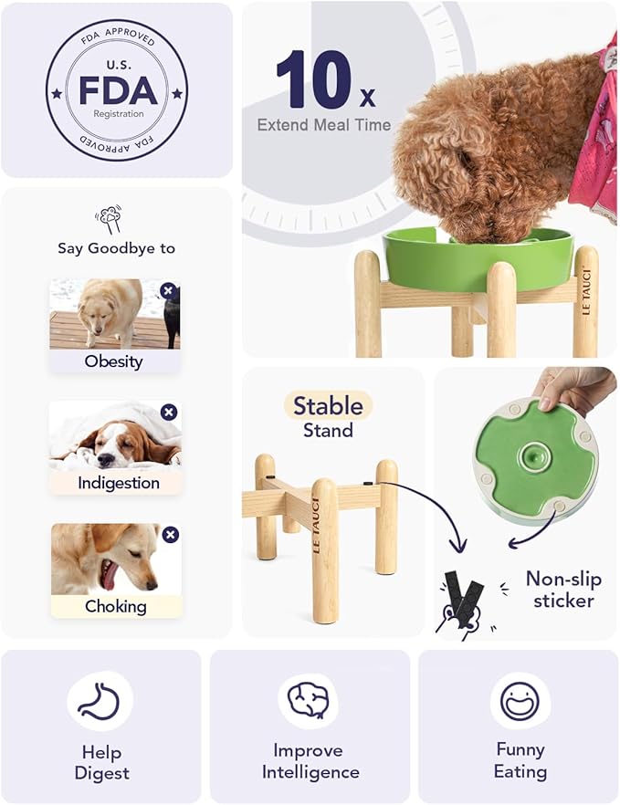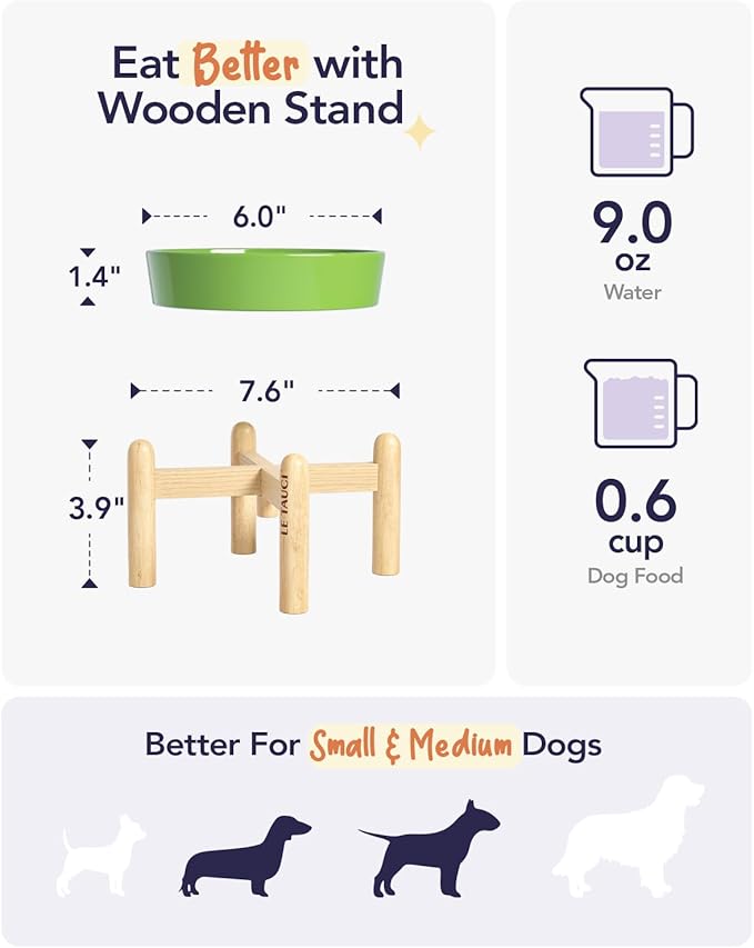LE TAUCI Ceramic Slow Feed Dog Bowls, Elevated for Small Breeds, Anti-Gulping, Non-Slip, 6 inch, Green