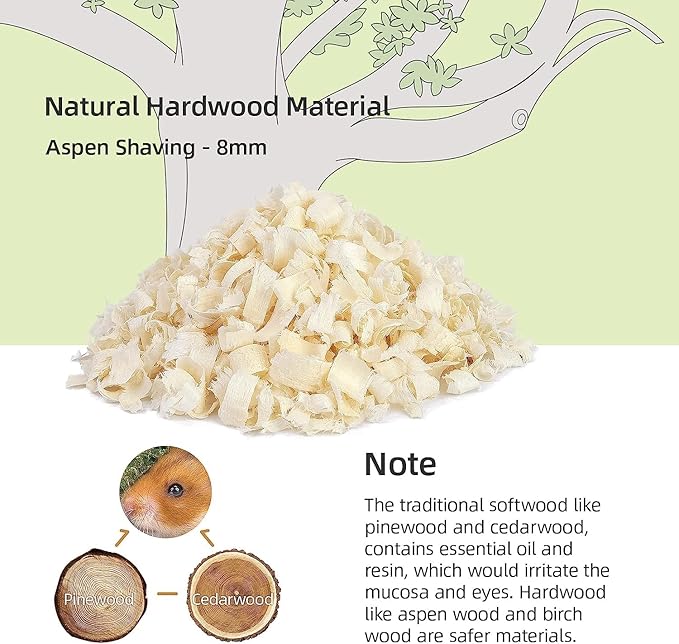 - [Soft Texture & More Comfortable] Niteangel tiny pet aspen bedding is made from natural Aspen wood and safe for small pets. The soft fluffy texture allows your critters to play freely on the aspen shavings bedding. The small pet bedding is not only good at absorbing the annoying smell of the cage, but also gives the hamster a natural and comfortable habitat.