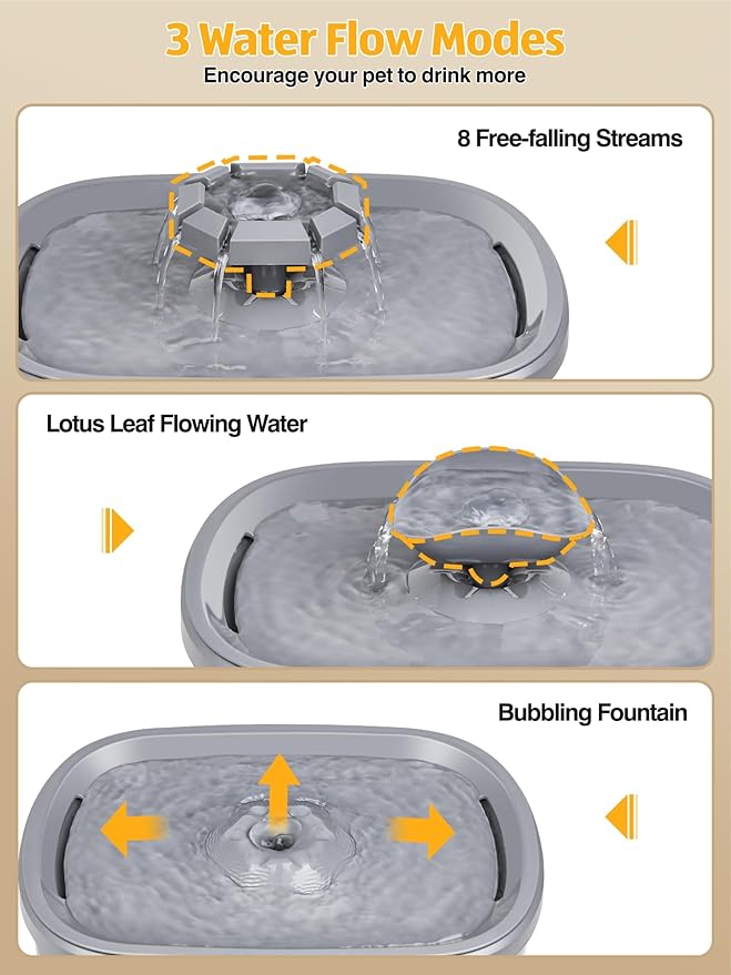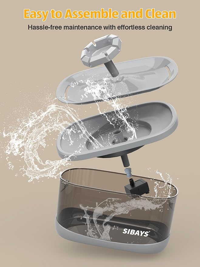 - [Smart LED Light & Ultra Quiet Pump] Lack Water Protection + Anti-clogging Protection+Colorful Light: SIBAYS large pet water fountain keeps colorful light in normal working state. When lacks water, the light will transfer into RED LIGHT, which reminds you to refill water. If the pump is clogged, the light will turn to FLASHING RED light. The pump is ultra-quiet (below 23dB), will not disturb your pets.