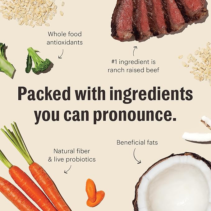 - INGREDIENTS YOU CAN PRONOUNCE Made with healthy ingredients you recognize — like ranch raised beef, carrots and broccoli — that have been cold-pressed and roasted into bite-sized pieces.