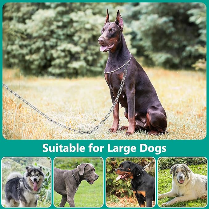 - 【Durable and Chew Proof】This metal tie-out cable is made of metal, and the chain and clasp can withstand the dog's chewing and dragging, without fear that the dog's teeth will penetrate it. The zinc coating on the surface protects the chain dog leash from rain and soil erosion and extends its service life.