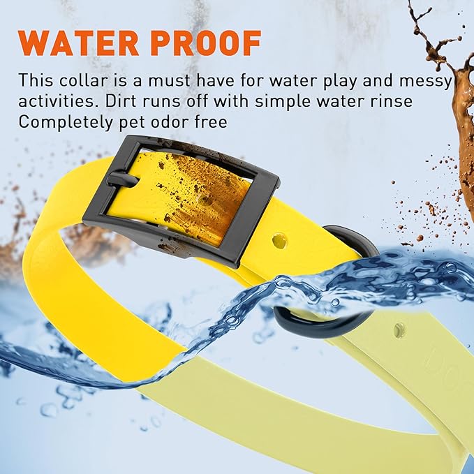 • Free Your Dog to romp in puddles and retrieve from lakes with the Dogline Biothane Waterproof Dog Collar. This water-repellent collar stays dry and odor-free, without shrinking or losing flexibility.