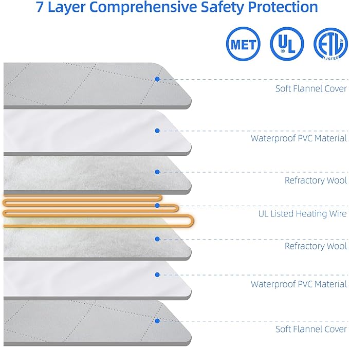 - Safety 7-layer Protection Structure: This Pet Heating Pad is made of UL-listed heating wire to protect that pet from burns. The soft PVC shell is waterproof and flame-retardant. The heating pad has a built-in smart temperature sensor to prevent overheating and protect pets. Do not let your pet lie on a pet heating pad that does not have a plush cover.