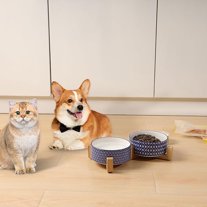 - DOUBLE BOWLS, DELICATE DESIGN - The thoughtful design of these double bowls offers convenience for your pets. You can use one bowl for food and another one for water, raising the dishes closer to your pet for more comfortable eating. Decorated with blue flowers and geometric patterns, these make them more unique that fit perfectly with any home decor style.