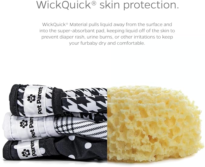 - HIGHLY ABSORBENT DOGGIE DIAPERS: Because we know your Great Dane 'goes' more than your Chihuahua, the diaper pad that is sewn into our dog diapers female increases with the size, because bigger dogs = more liquids. WickQuick material wicks liquid from the surface and into the dog period diapers, keeping your furbaby dry and reducing urine burn or irritation. Our diapers also have a waterproof outer layer to prevent leaks and damage to rugs, carpets, upholstered chairs and sofas.