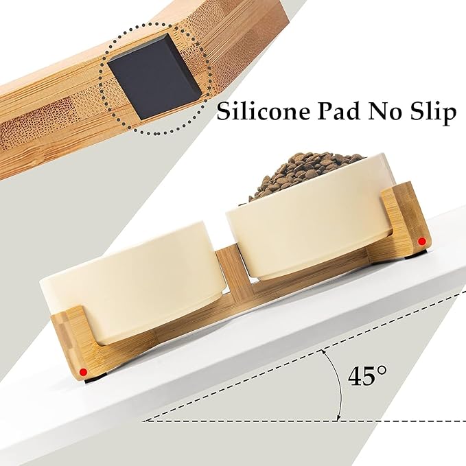 - [Double Bowl Design]:One dog bowl for food and one for water, Each ceramic cat bowl has a Unique wooden stand, raising the dishes closer to your pet for more comfortable eating