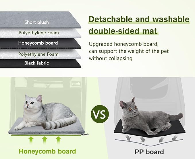 - 【 Sturdy & Safety 】: The cat backpack carrier has sturdy steel wire frames on the left and right sides, as well as fiber rods on the top and bottom, which can effectively prevent collapse, allowing for maximum stability and shape retention. The double-sided pad bottom features a removable and washable cover. It also contains pearl cotton and honeycomb boards in the middle, which optimize stability and enhance comfort. The built-in adjustable safety rope and locked zippers prevent your pet from escaping.