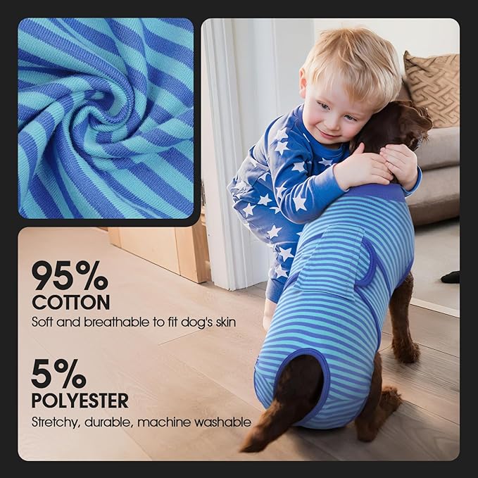 - [BREATHABLE FABRIC]: Our dog recovery suit is made of 95% cotton and 5% spandex. The recovery shirt is highly elastic and breathable, allowing the dog to feel comfortable and move freely after wearing it. No deformation after machine wash.