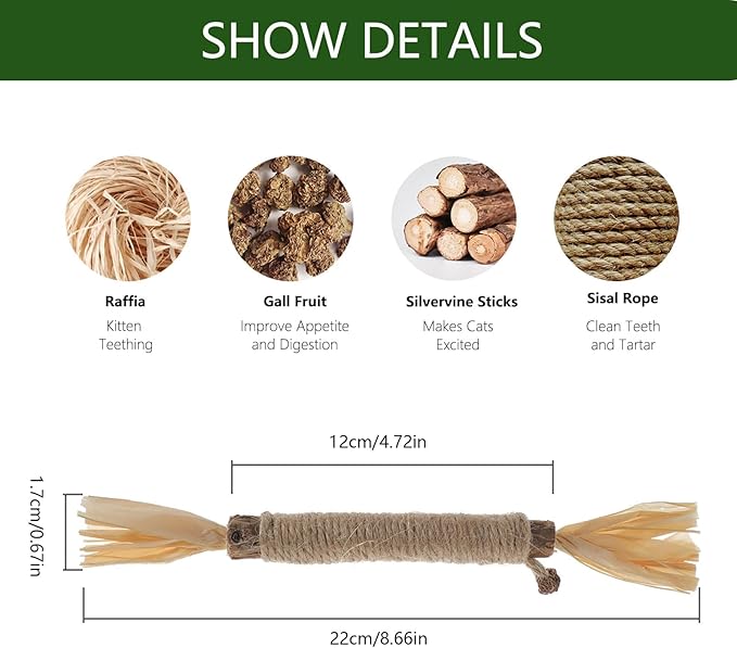 - Natural Plant-Based Ingredients: Safe silvervine sticks for cats made with raffia grass, gall fruit & sisal rope. No additives or chemicals - just pure chewing fun!
