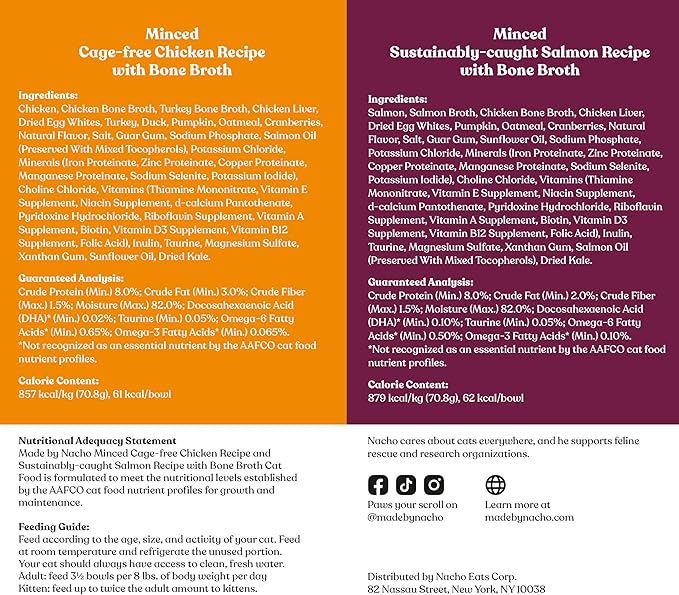 - Variety pack featuring five (5) sustainably caught minced salmon cups and five (5) cage-free minced chicken cups HIGH-PROTEIN, NO NONSENSE -Variety pack featuring five(5) cups of Minced premium, cage-free chicken and five (5) sustainably-caught salmon. Both are surrounded by a flavorful bone broth for a bite-sized, cat-pleasing texture