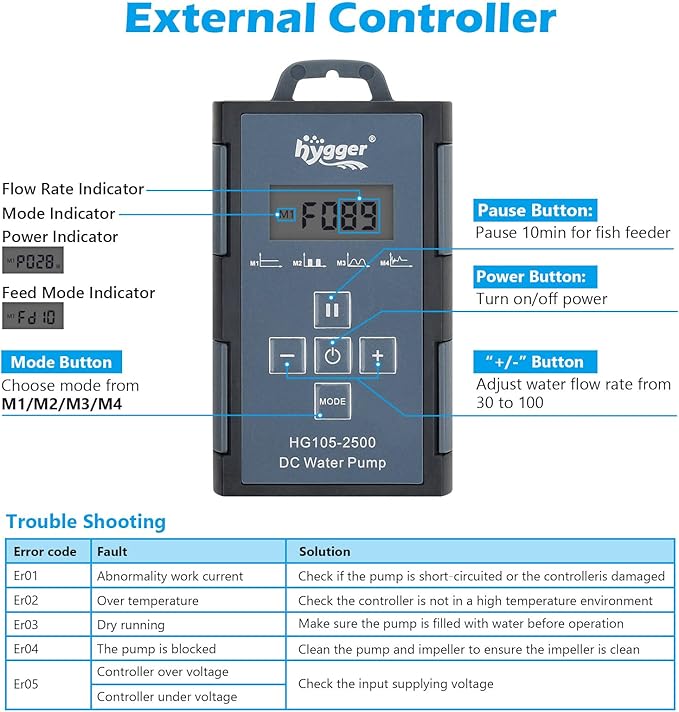 - 【5 Modes & Adjustable Flow Rate】Five operating modes can be set: ①Constant flow mode; ②Classic mode; ③Sine flow mode; ④Random flow mode; ⑤10-minute feeding mode. With 30%-100% different speed settings, the water flow can be accurately adjusted to meet your different needs. This aquarium water pump have an external controller, which is easy to operate and avoids wet hands