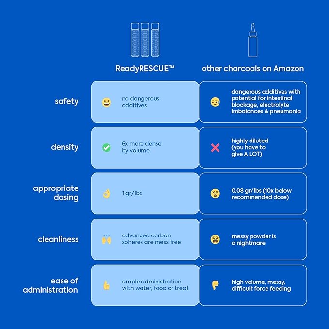 - SAFE AND RELIABLE: Worry less about accidental overdoses or false alarms. ReadyRESCUE is completely safe, even if poisoning isn't confirmed. It passes harmlessly through the GI tract absorbing potential poisons along the way, ensuring your pet's safety every time.