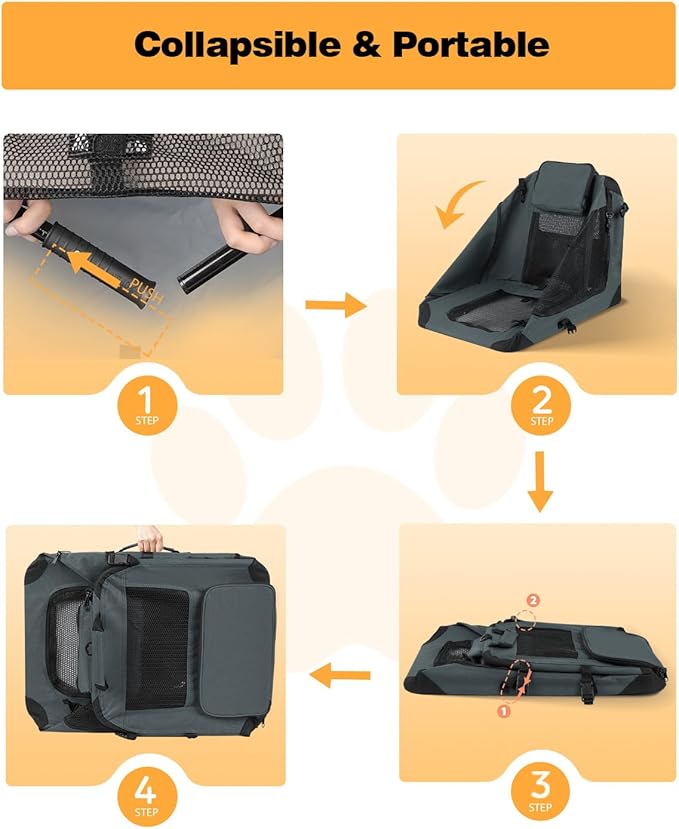 - 【Easy Assembly & Collapsible】This travel dog crate can be effortlessly assembled in 2 minutes, ensuring a stress-free experience for both you and your furry friend. When not in use, its collapsible design allows for compact storage, making it convenient to stow away under a seat or in any other confined space. Elevate your pet travel experience with this innovative and space-saving solution!