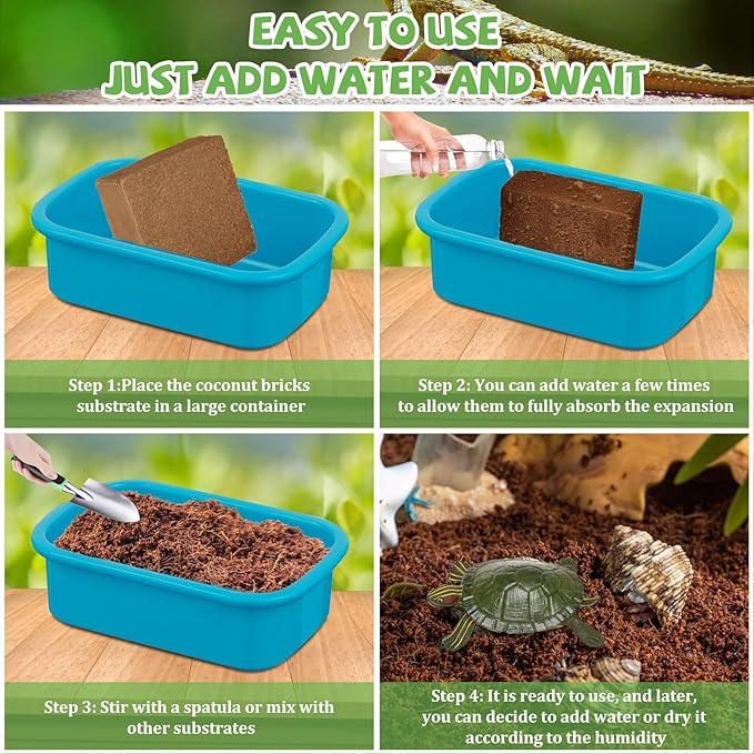 - Easy to Use and Store: These coco bricks are compressed and dense. Just soak the brick in water, coco coir will instantly and easily soak up water and expand into a clean, fluffy substrate. Our Coconut husk fiber is a great substrate for any reptile or amphibian that needs a substrate bedding that can retain moisture
