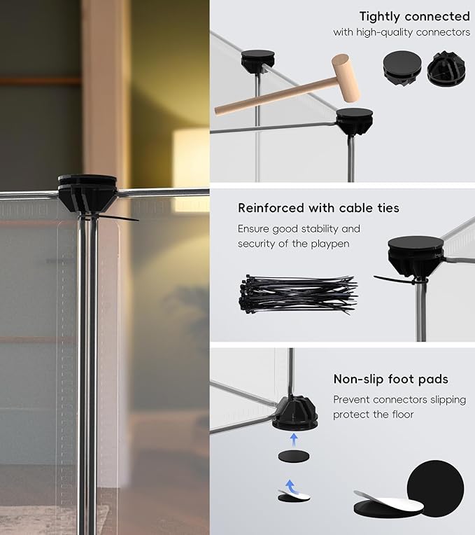 - ๐๐ญ๐๐๐ข๐ฅ๐ข๐ญ๐ฒ ๐๐ง๐ ๐๐ซ๐จ๐ญ๐๐๐ญ๐ข๐จ๐ง: Equipped with 42 nylon straps to securely fasten the small pet fence, and 12 anti-slip mats to prevent the fence from sliding on the floor, providing a stable play area for your pets.