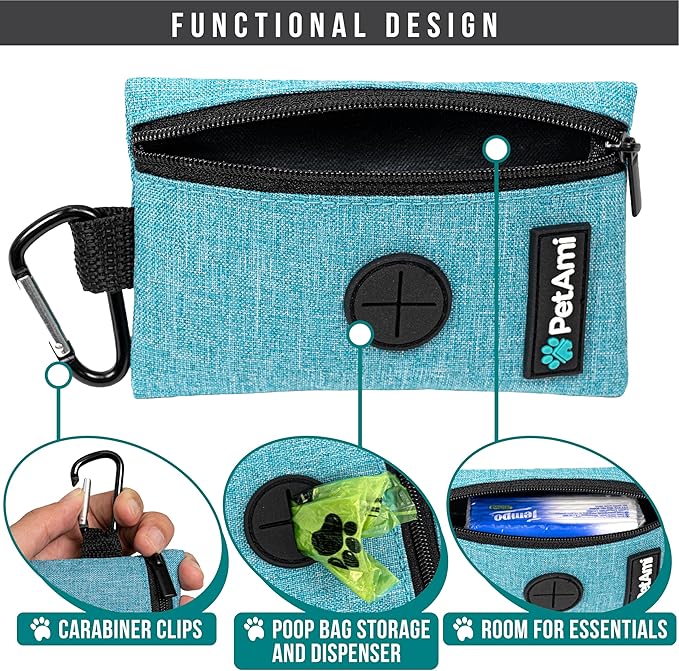 - TEAL BLUE DOG WALKING BAG: PetAmi poop bag holder dispenser includes one roll of dog poop bags, measures 5 x .25 x 3.25 inches, and is made of durable oxford polyester. Doggy trash bag carrier is refillable and is compatible with most dog poop bag rolls. This pet travel bag is a great gift for dog mom, dad, parents, owners, and trainers. Comes in multiple colors to mix and match your dog leashes.