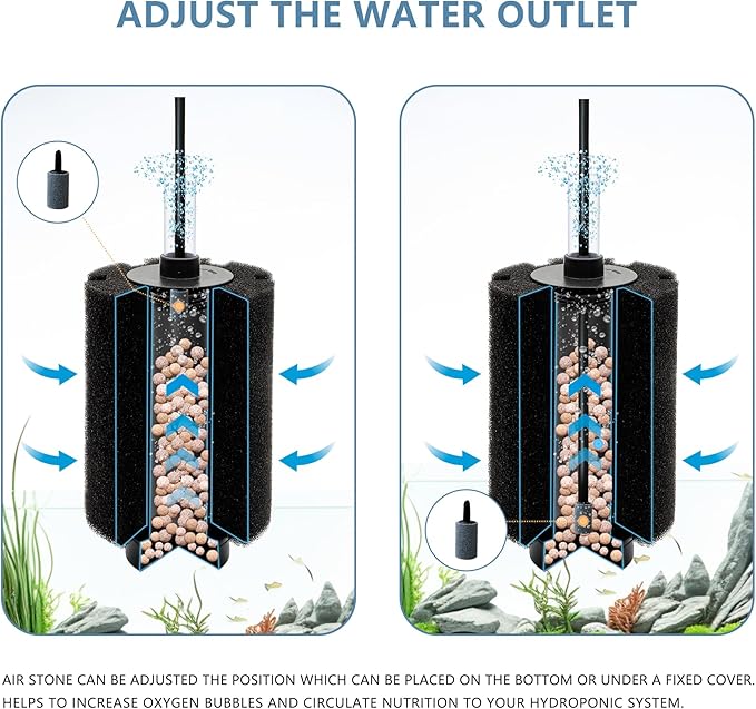 - 【Bubble Diffuser Design】The fish tank filter adopts air power and water circulation. The Air stones creates tiny bubbles, smooth water flow, and reduced noise, creating a quiet and comfortable environment for your aquatic pet.
