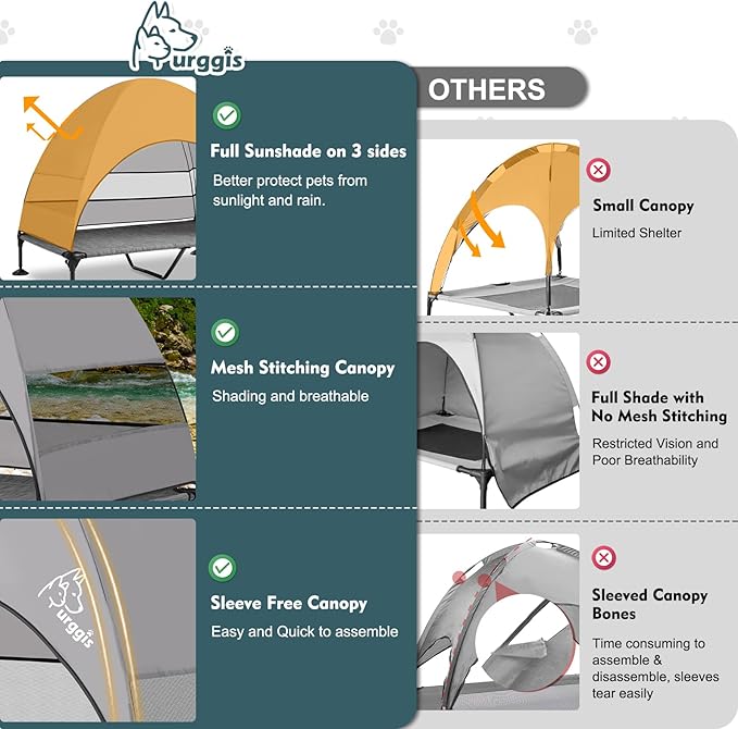 - Wide Application: With the unique adjustable feet, this bed is great for outdoor use beach, picnic, camping, yard, patio, it keeps pets cool, dry and off bugs for a great outdoor time. We can also remove the canopy to provide dogs a comfortable place to spend their indoor time. This dog cot bed is under Furggis 100% satisfactory guarantee. If you have any questions with it, please tell contact us, we will get back to you within 24 hours and work it out for you as soon as possible.
