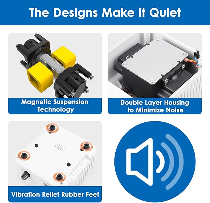 - SUPER SILENT - This koi pond aerator is extremely quiet with the magnet suspension technology, the straight airflow path, the double-layer housing and the vibration-relieving rubber feet.