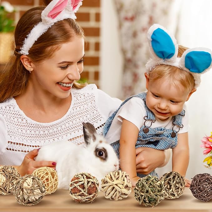 - ✨【Perfect Combination】Our bunny chewing toy set includes 8 grass balls of different texture, 1*Skinless Rattan Ball, 1*Brown Skinless Rattan Ball, 1*Seaweed Ball, 1*Corn Leaves Ball, 1*Seaweed +Corn Silk Ball, 1*Skinless Rattan +Seaweed Ball, 1*Palm Fibers + Seaweed Ball, 1*Timothy Hay + Seaweed Ball. It's a great gift for furry friends.