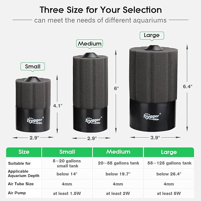 - Three Size For Choice: Small: 2.9"W x 4.1"H, it works pretty well filtration for 5 to 20 gallon aquariums with under 14” depth. Medium: 2.9"W x 6"H, suggested for 20 to 55 gallon medium-sized aquariums with under 19.7” depth. Large: 3.9"W x 6.4"H, suggested for 55 to 125 gallon aquariums with under 26.4” depth