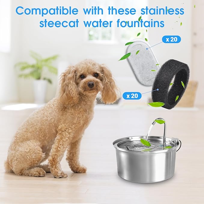 40 Pack Cat Water Fountain Filters-Cat Fountain Replacement Filters for Stainless Steel 108/3.2L& 67oz/2L Adjustable Water Flow Pet Water Fountain(20 Pack Pet Water Filter Refills+20 Pack Sponges)