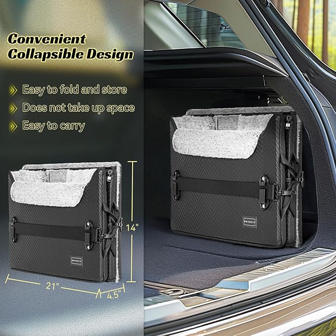 - [Pet-Friendly Dog Seat for Car] The dog booster car seat is made of high-quality waterproof PU leather, which is easy to wipe clean. The Imitation rabbit plush lining and well-designed pillow keep pets comfortable and give nervous dogs a smooth ride. The innovative design also allows the dog car seat to be easily folded flat for storage.
