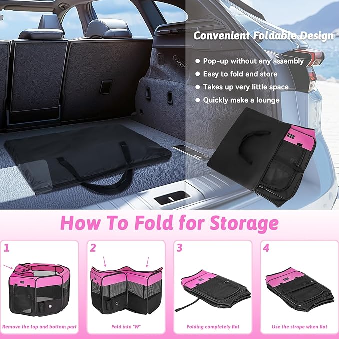 - 3-Second Setup & Travel-Ready:This lightweight pet playpen comes with a carrying bag for easy transport, sets up quickly and folds flat, includes two pockets and a water bottle holder, ideal for travel and camping with no assembly required