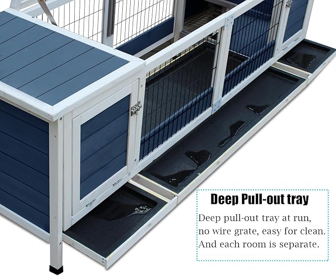 - Easy to clean: It's easy to gain access to the inside by opening the side doors and the top wire for daily cleaning. Your pets can stay in the wood hut with the sliding door locked up while you are cleaning the pull out tray