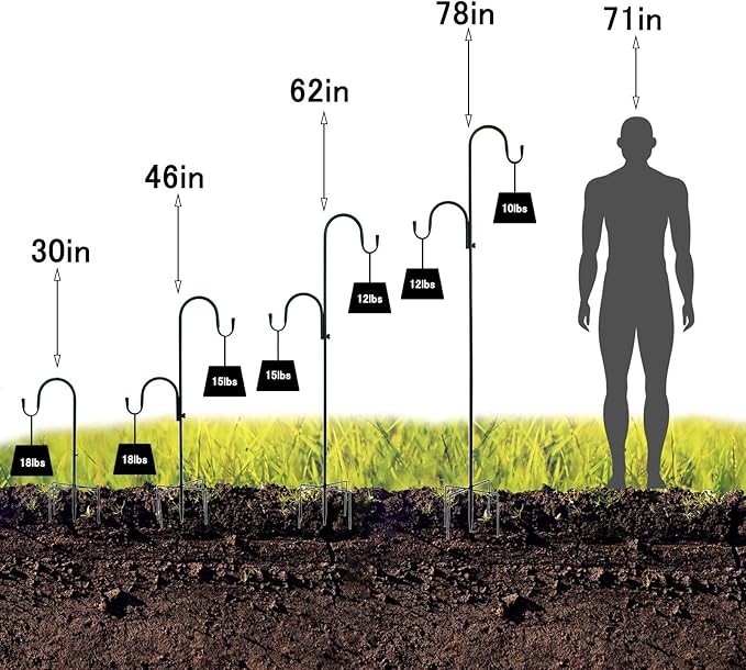 - 【STURDY & DURABLE】 With a 3/4 inch diameter wrought iron metal garden hanging hooks, At a height of 30", each hook is suitable weight that no more than 15lbs; 46" in height fits no more than 12lbs;62" in height fits no more than 10lbs;78"in height fits no more than 8lbs.(NO OVERLOADING) Tip: On both hooks Hanging items makes it easier to balance.The 5 base prongs must all be plugged into the lawn to be provide better stability.