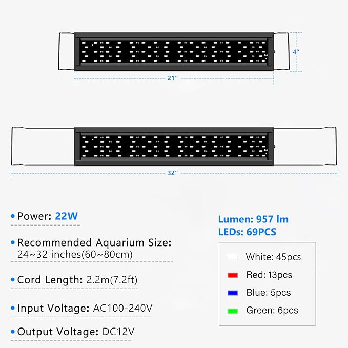 AQQA Aquarium Light,Full Spectrum Fish Tank Light for Plants,3 Mode+Timer+Adjustable Brightness,High Brightness LED Beads with Extendable Brackets for Freshwater (22W for 24-32inch)