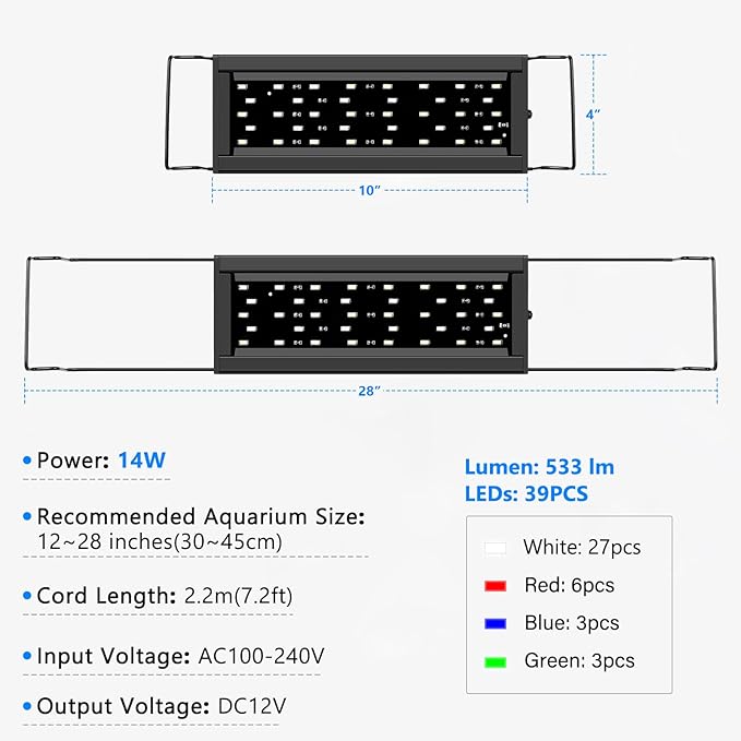 - High Quality Fish Tank Light: 5 rows of high brightness LED light beads, high transmittance, straight to the bottom of the water; White, red, green and blue light beads scientific combination very suitable for plant growth; Good heat dissipation of the ABS shell; Retractable metal stand can be adjusted within a certain range to best fit the fish tank distance