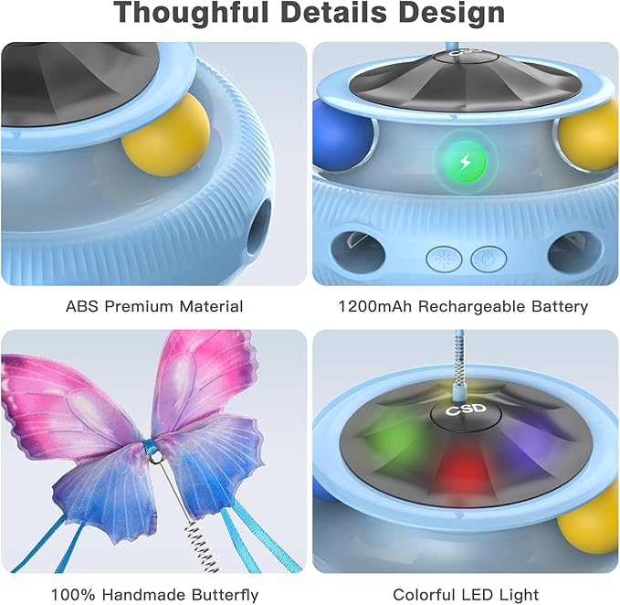 - Rich replaceable accessories:The cat toys for bored indoor,it come with fluttering butterfly*1,brown fluttering feather*1,multicolor shooting feather*2,blue shooting feather*2,blue yellow shooting Feather*2, bring endless joys and happiness for your furry friends
