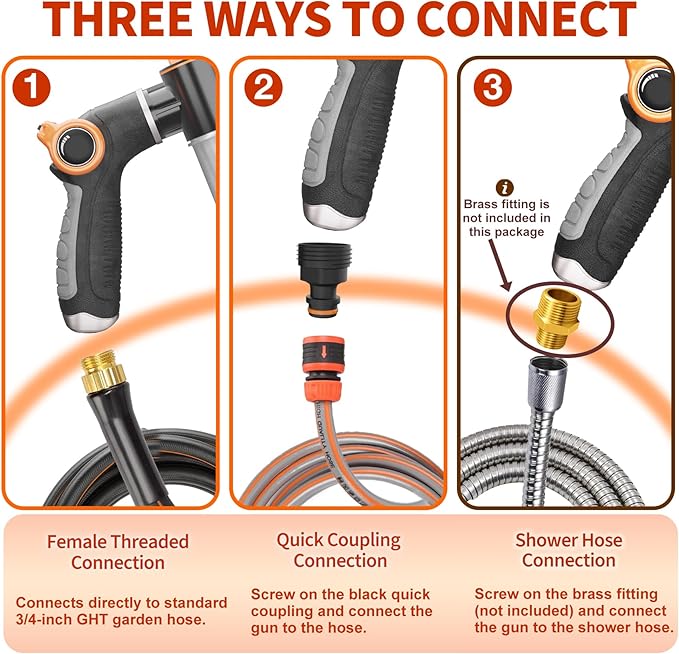 - 【Strong Applicability】The dog wash hose attachment can be connected to garden and shower hoses. To connect the garden hose, simply connect the standard 3/4-inch GHT garden hose directly or screw on the black quick-connect head to connect the hose. To connect the shower hose, you need to use the brass bathroom hose connector (not included)