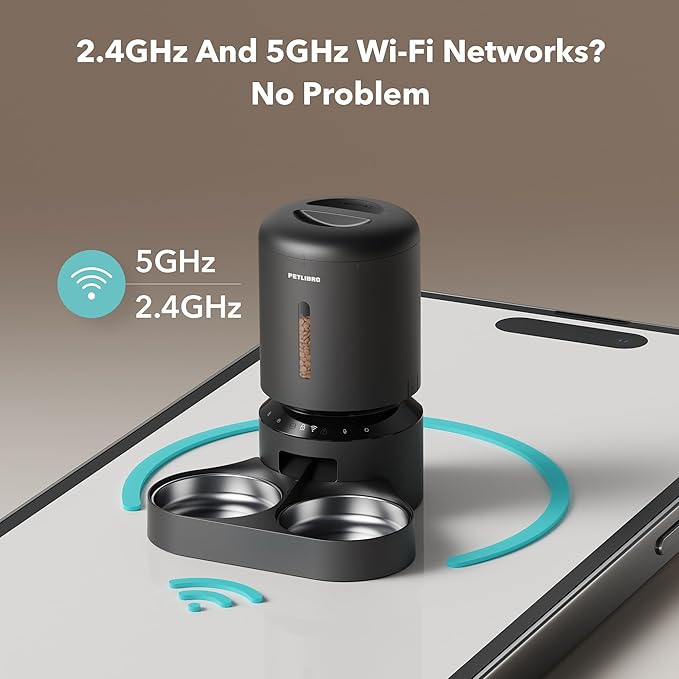 - APP CONTROL AND 5G WIFI COMPATIBILITY: PETLIBRO automatic cat feeder for 2 cats supports both 5GHz and 2.4GHz WiFi for a stable connection. Download the iOS/Android app to program diets and monitor feedings remotely. Multiple users can set feeding times and view feeding records.