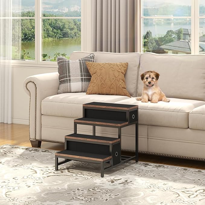 - 【Sturdy and Stylish】 Crafted with a durable metal frame and quality wood grain engineered board, providing a sturdy structure. The platform features a comfortable sponge pad with a removable and washable tarp cover. The non-slip carpeted stairs ensure your pet's safety. Supports a maximum weight of 100lbs.