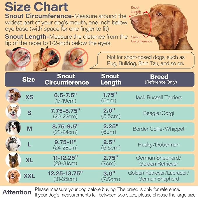 - Size S (Cir: 7.75-8.75”, length: 2–2.75”) – This dog muzzle for small & medium dogs fits Poodle, Beagle, Corgi, etc., but not for highly anxious dogs. and short-snout dogs like Chihuahua. Measure your dog's snout circumference and length per the size chart or video. If between sizes, SIZE UP! Ensure the muzzle fits comfortably, with the nose not touching the edge