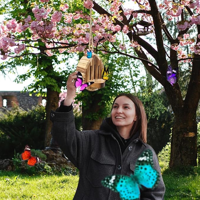 Picowe Wooden Butterfly House - Natural Habitat Nesting Box With Feeder for Butterflies, Bees, Ladybirds - Hanging Garden House for Outside, Open Door