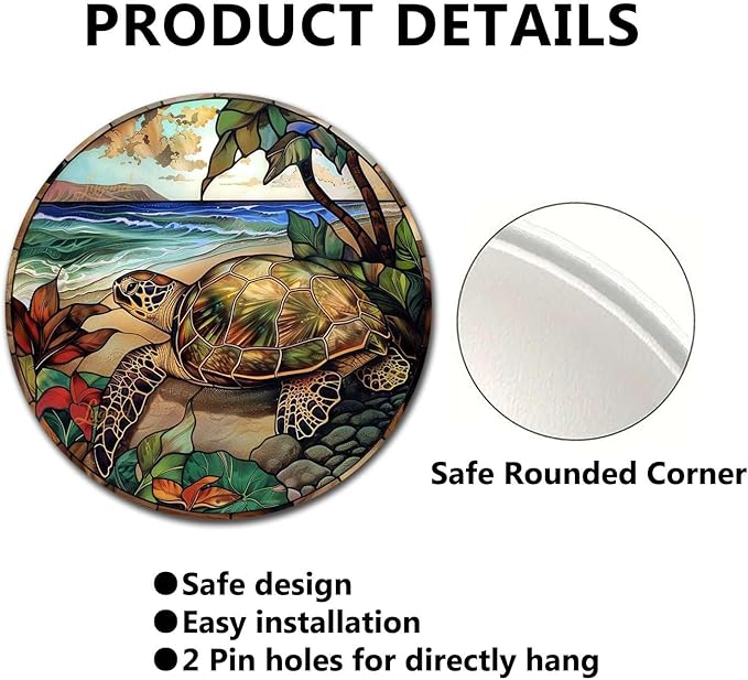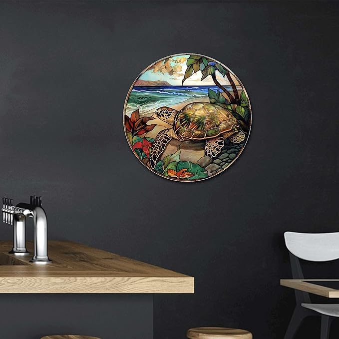 Lygond Metal Sign Tin Sign Circular Stained Glass Turtle Decor Outdoor for Yard 8×8 Inches