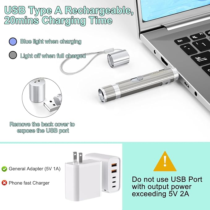 - USB Direct Charging: No dry batteries needed! Unplug the back cover and plug into USB port (adapter/computer/car) to charge, about 20mins fully charged