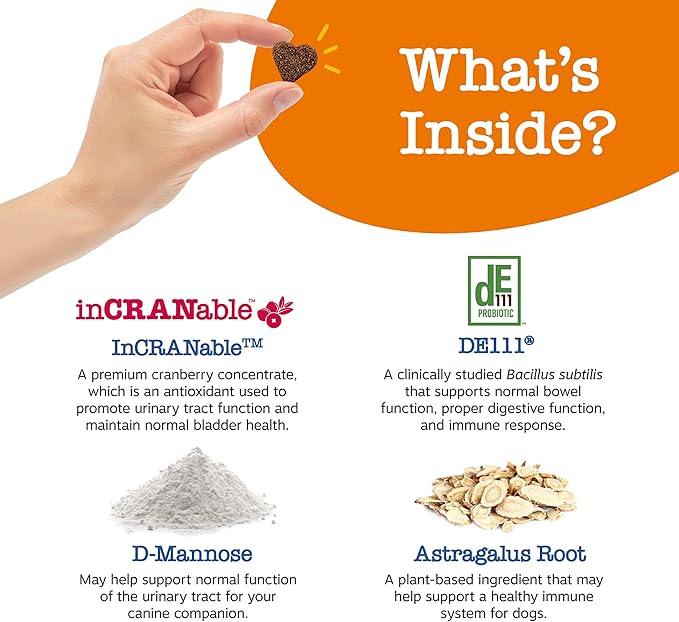 - Featuring InCRANable – Each chew features this premium cranberry concentrate, which is an antioxidant used to promote urinary tract function and maintain bladder control for dogs.