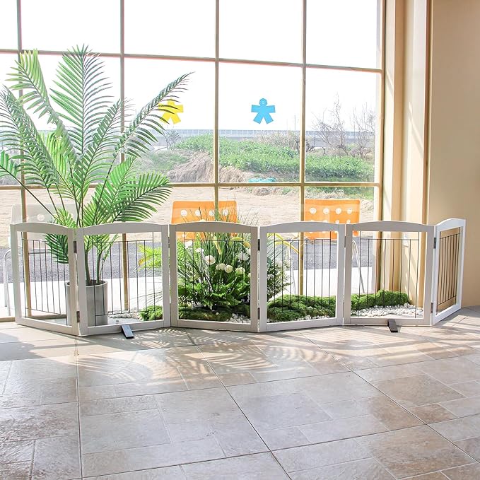 - 【Simple and Firm】This convertible wooden dog gate is a pet fence, room divider, and pet pen all in one. It combines wood and electroplated steel bars. Equipped with non - slip rubber feet, it protects your floor.