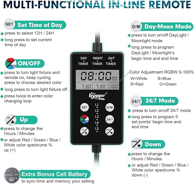 - INTUITIVE REMOTE CONTROL: Easily program and control integrated in-line remote allows you to conveniently switch between daylight-moonlight mode, 24/7 mode or manually adjust 8 colors ( White, Red, Orange, Yellow, Green, Cyan, Blue and Purple) and brightness levels (0%-100%). Comes with a cell battery to memory your setting in case power cut
