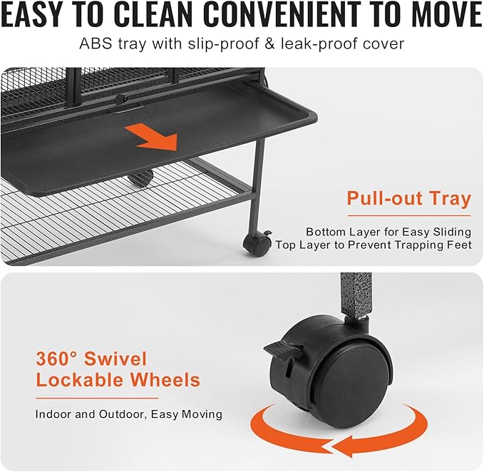- Easy to Move and Store: Our metal rolling pet cage comes with lockable rolling wheels, allowing easily move your pets from indoors to outdoors, letting them enjoy sunlight and nature. Additionally, there's a large storage shelf above the wheels for keeping pet supplies organized and saving space.