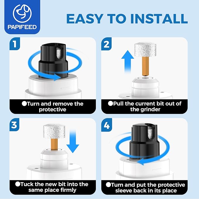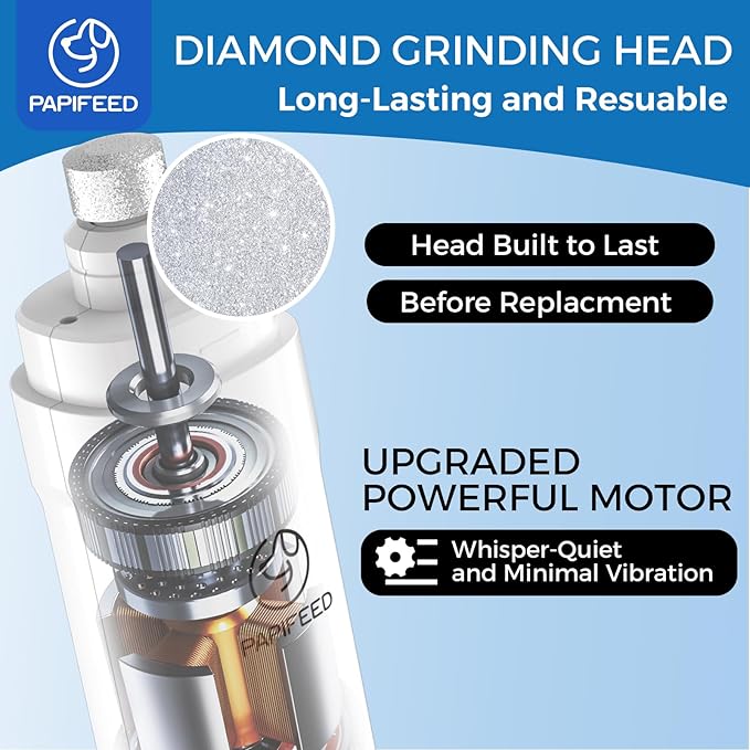 - š¾ćWHISPER QUIET&MINIMAL VIBRATIONćWith the latest mute technology and innovative powerful motor, the PAPIFEED dog nail file operates quietly, emitting less than 40 dB of noise. Additionally, the ergonomic body design of the dog nail trimmers reduces noise and vibration. By being exceptionally quiet and producing minimal vibration, these features help alleviate pets' fear and anxiety during the nail grooming process.