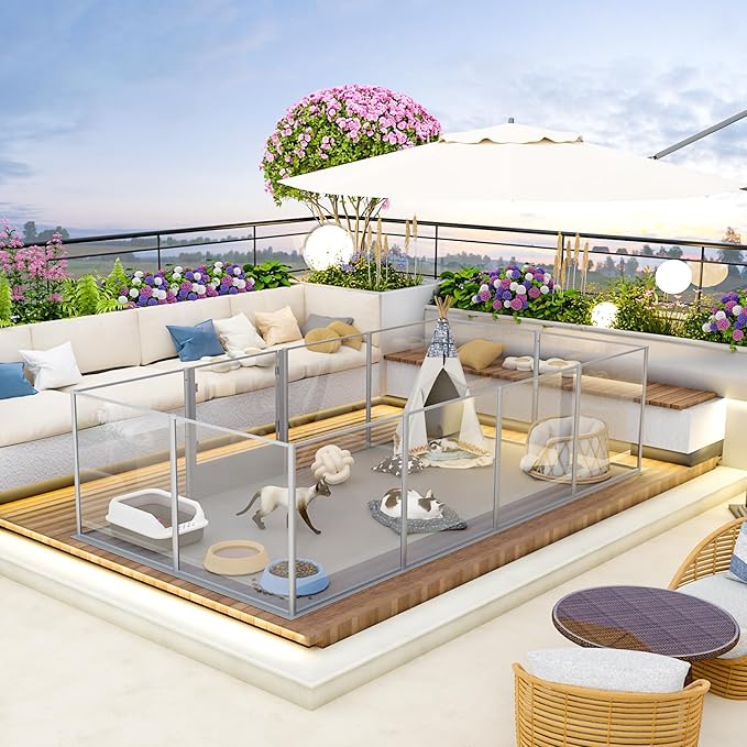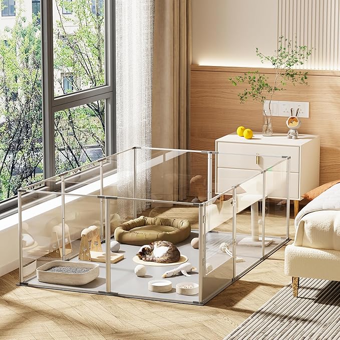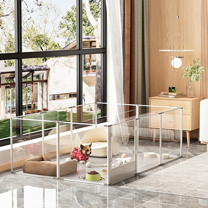 - Clear Acrylic Fence Design - Crystal-clear acrylic dog fence playpen enables you can interact with your pets closely, 360°high transparency and wide vision, it’ll relieve your pets from anxiety, they also make sure you are by their side, equipped with a door for dog mom/ pets to come and go easily, so this is a unique gift for your loved friends, get this fence in the room, instantly upgrade your home space