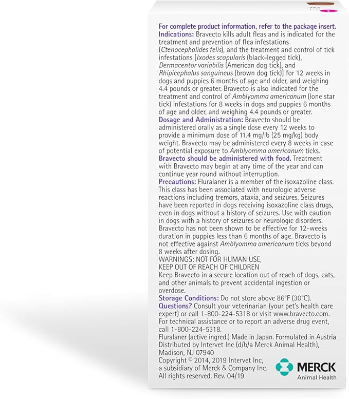 BRAVECTO Chew for Dogs, Flea & Tick, 1 Chew, 12 Week Supply, 88-123 lbs., Pink Box