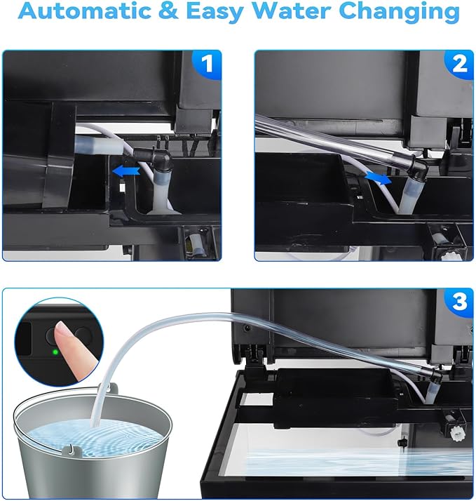 - Built-in 3-in-1 Filter System: The desktop fish tank is equipped with a quiet, hidden pump that provide filtration, oxygenation, and water circulation, creating a healthy environment for your fish while reducing maintenance. It also comes with a hose for easy water changes—just connect it to the pump for a quick and hassle-free water exchange, keeping your tank clean with minimal effort.