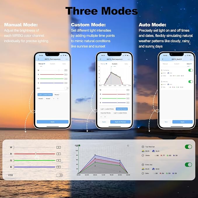 - Manual/Auto/Custom 3 Modes: The aquarium light offers Custom Mode, allowing you to set up to 24 time points for a personalized sunrise and sunset cycle. Auto Mode lets you schedule light simulate dynamic weather conditions such as cloudy, rainy, or sunny days, creating a natural environment in your tank. Manual Mode provides precise brightness and color adjustments